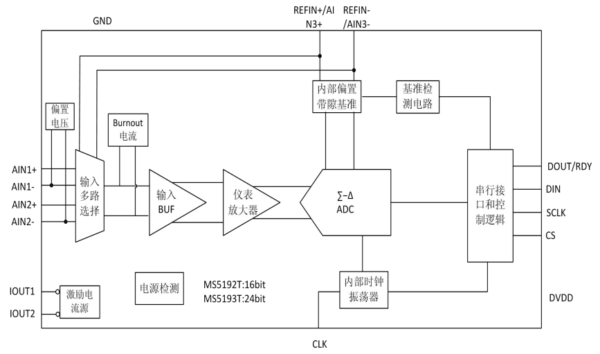 四、高精度ADC芯片-MS5192T/MS5193T內(nèi)部框圖: